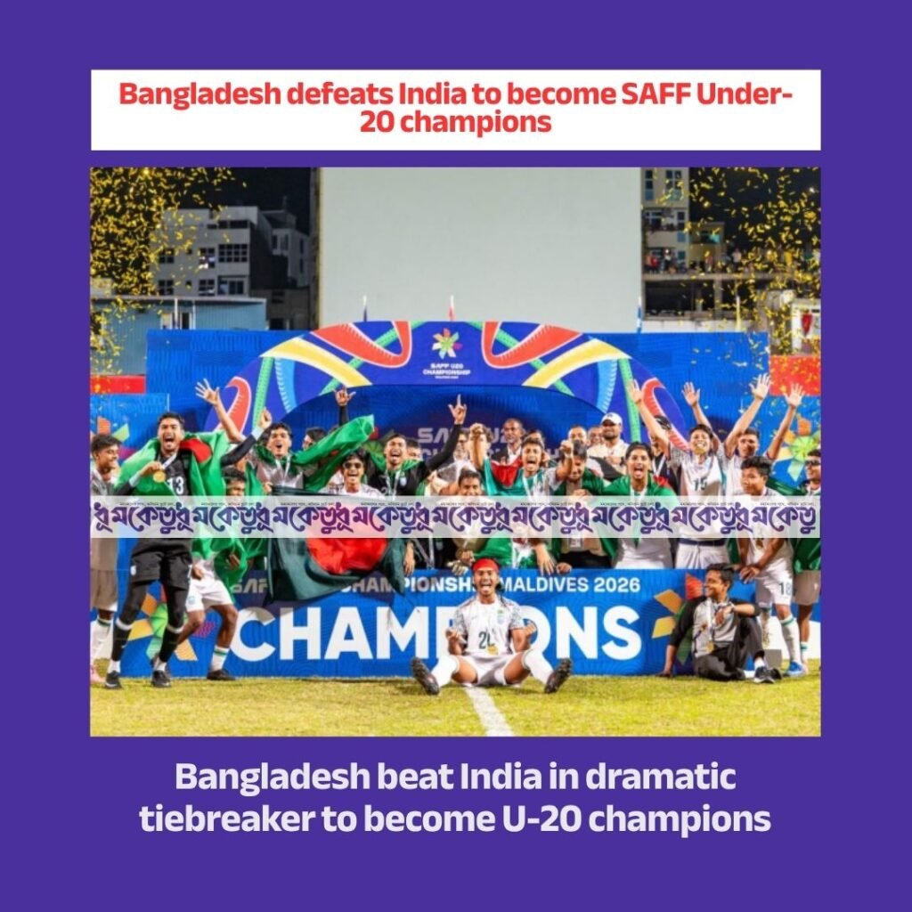 Bangladesh have won the Under-20 Football Championship title after beating India in a thrilling tie-breaker after a goalless final. The red-green representatives won the final 4-3 at the National Football Stadium in Male, the capital of the Maldives, on Friday (April 3).