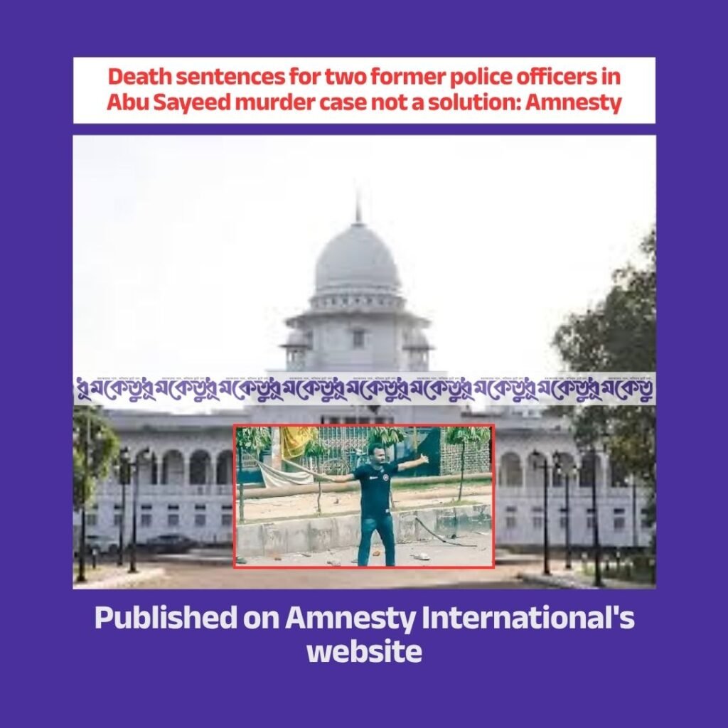 Amnesty International has said that the death penalty for two former police officers in the murder case of Abu Sayeed, a student at Rangpur’s Begum Rokeya University, the first martyr of the July uprising, is not a solution. The London-based human rights organization said this in a report published on its website on Friday.