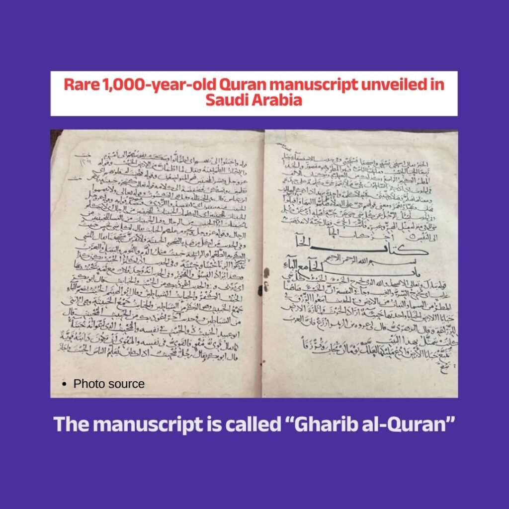 The King Abdulaziz Public Library in Riyadh, Saudi Arabia, has unveiled a rare 1,000-year-old manuscript of the Quran. The manuscript is called “Gharib al-Quran” and was written by the renowned scholar Abu Ubaydah Ma’mar ibn al-Musanna.